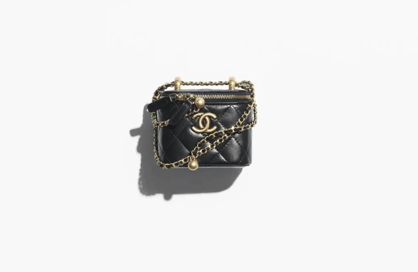 This Chanel vanity-style mini bag is compact yet chic—ideal for light essentials like a lipstick, cardholder, and keys. The structured box shape, top handle, and long chain strap offer versatile styling options, from handheld elegance to a relaxed crossbody silhouette.